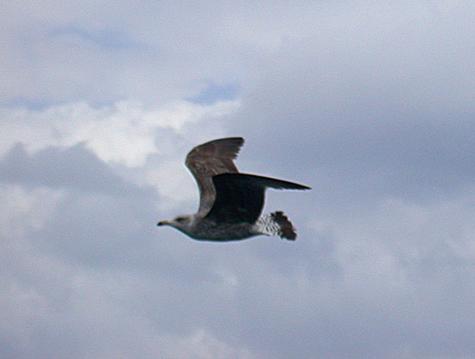 The Atlantic gulls have very dark grey backs, and small primary mirrors, restricted to the outermost primaries on the adult bird below. Note the marked tail band and relatively dark head of the first summer bird.