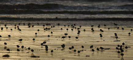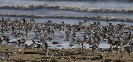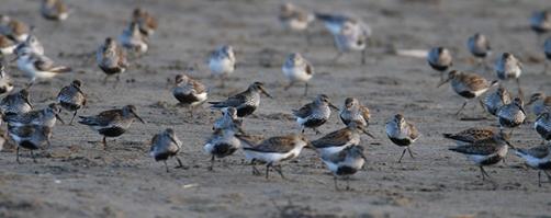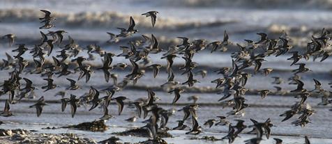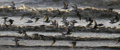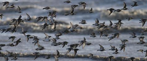 Berrow beach in evening – strong winds produced 2 manx shearwater offshore. Many waders at high tide, including ringed plover, dunlin, and sanderling in winter and summer plumage.
