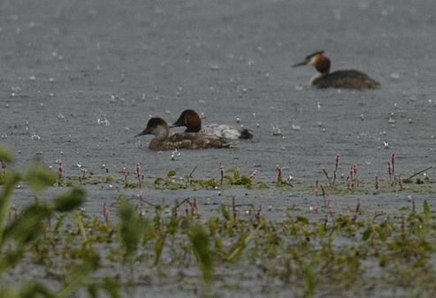 Spent some time photographing the pochard x red-crested pochard hybrid, the same bird that I digiscoped last year. One shot gives a size comparison with a male pochard. It spends a lot of time dabbling as well as diving, and approached close to Stratford hide. Paul Burrows believes the bird is a hybrid on account of its small size, atypical face markings, and grey, rather than white trailing edge to the wing (though looks fairly white in my photo below).