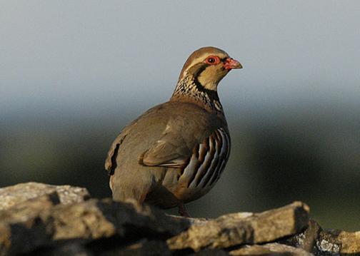 An evening trip to Marshfield, hoping to hear quail, but none calling. Lots of farmland birds however – stock dove, yellowhammers, skylarks and linnets. Highlights included a little owl near Down farm, 3 corn buntings singing between ST 792743 and 802753, my first grey partridge for many years at St 793743, many red-legged partridges (one below), ca. 4 brown hares and a badger.